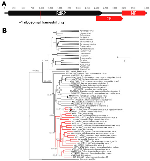 Molecular characterization and phylogenetic analysis of the vole-associated tombusvirus 1 (Va-TV-1). In silico predicted ORFs are shown in panel (A) with those coding for the viral replicase (RdRP: RNA-directed RNA polymerase) joined by ribosomal frameshifting shown in black and those encoding the capsid (CP) and movement (MP) proteins in red. The phylogenetic placement of Va-TV-1, indicated by a red dot, within an unclassified clade of the family Tombusviridae is illustrated in panel (B). The tree is based on the RdRP aa sequence (only the second ORF, alignment of 427 aa) and was built with the maximum-likelihood method based on the LG + F + R10 model with IQ-Tree. The outcomes of the SH-aLRT and bootstrap tests (1000 replicates) are shown for the main nodes. Viruses from the Carmotetraviridae and from classified tombusviral genera were used as outgroups and the corresponding clades are collapsed and indicated by triangles. The tree included a total of 78 sequences. Branches of clades with molecular evidence for possible −1 ribosomal frameshifting are labelled in red. The grey branch indicates a short sequence for which the presence of molecular markers for ribosomal frameshifting could not be verified. For each sequence, the accession number and the virus names are indicated.