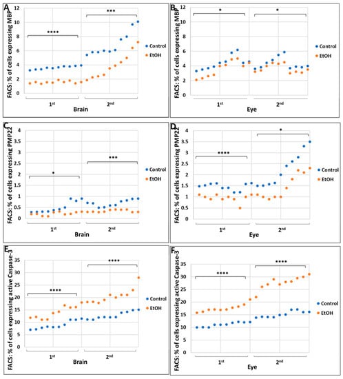 2.2. Prenatal Alcohol Exposure Inhibits Expression of the CNS and PNS Myelination Markers Myelin Basic Protein (MBP) and Peripheral Myelin Protein-22 (PMP22), Respectively, and Increases Expression of the Apoptosis Marker Activated Caspase-3, during Eye and Brain Development