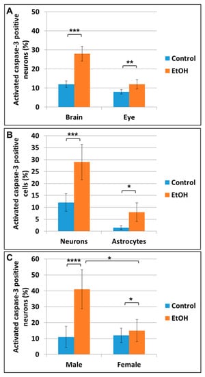 Prenatal EtOH exposure induces neural injury in fetal brain and eye, and affects male fetuses more than females. Human fetal brain and eye tissues from 20 EtOH-exposed fetuses and 20 matched unexposed controls were dissociated through 70 mM mesh, and cells were assayed by FACS using β-Tubulin as a neuronal marker, GFAP as a glial marker, and activated caspase-3 as an apoptotic marker. The value for each fetus was the average of the triplicate determinations. The % of each cell type that was labeled for activated caspase-3 was determined and evaluated with respect to fetal sex and in vivo exposure to EtOH. (A) In utero exposure to EtOH increased apoptotic signaling in neurons of fetal brains and eyes. β-Tubulin was used as a neuronal marker. (B) Apoptotic signaling was increased in astrocytes and neurons in EtOH-exposed brains (n = 20 fetuses). (C) The effect of exposure to EtOH on neuronal apoptotic signaling was greater in male fetuses (3.65-fold) than in females (1.50-fold). Each assay was performed in triplicate. Error bars indicate standard deviations based on numbers of fetuses, not the number of triplicated assays. * p < 0.05; ** p < 0.01; *** p < 0.001; **** p < 0.0001. In (C), the p value * above the top line linking the male and female groups refers to the difference between male and female fetuses regarding the fold changes in apoptotic signaling in EtOH-exposed vs. non-exposed control fetuses.