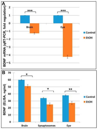 2.4. Prenatal EtOH Exposure Inhibits BDNF mRNA and Protein Expression in Fetal Eye, Brain and Synaptosomes