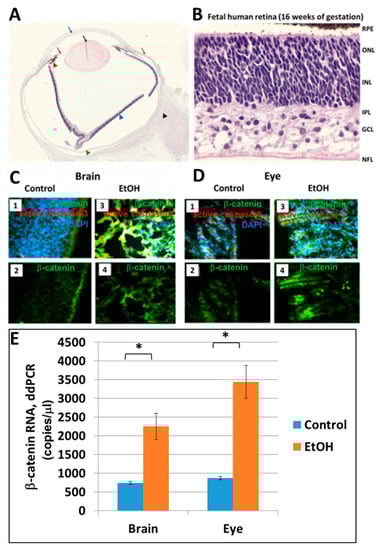 Prenatal EtOH exposure upregulates β-catenin in fetal brain and eye in EtOH-exposed fetuses compared to matched unexposed controls. (A) Fetal eye globe (16 weeks GA) in sagittal section: the cornea (cyan arrow), iris (red arrow), lens (black solid arrow), and ciliary body (red arrowhead) can be identified. The anterior chamber is the space between the anterior iris and posterior cornea, and the posterior chamber is comprised of the space between the vitreous and the posterior aspect of the iris. In the field of the posterior globe, the head of the optic nerve (black arrowhead), the retinal pigment epithelium (RPE) (green arrowhead), retina (cyan arrowhead), and the sclera (green arrow) can be identified. (B) Fetal human retina (16 weeks GA). Hematoxylin and eosin staining. RPE = retinal pigment epithelium; ONL = outer nuclear layer, containing the nuclei of the future photoreceptors (the photoreceptor outer segments do not yet exist); INL = inner nuclear layer, containing nuclei of the Müller cells, and the where the horizontal, bipolar and amacrine cell bodies will be; IPA = inner plexiform layer; GCL = ganglion cell layer; NFL = nerve fibre layer. (C) Effect of EtOH exposure on β-catenin in fetal brain. Brain sections were collected and prepared from EtOH-exposed 2nd trimester fetuses and unexposed 2nd trimester controls, and stained with DAPI (blue) and caspase-3 (red) (panels 1 and 3). Panels 2 and 4 show staining for β-catenin only (green). (D) Effect of EtOH exposure on β-catenin in fetal eye. Panels 1 and 3: β-catenin and DAPI staining. Brain and eye sections were prepared from EtOH-exposed 2nd trimester fetuses and stained with DAPI (blue, which appears as cyan because of overlap with green) and activated caspase-3 (red which appears as yellow because of overlap with green, or as magenta because of overlap with blue, or as light yellow because of overlap with blue and green). Panels 2 and 4, β-catenin (green). (E) EtOH-induced upregulation of β-catenin mRNA expression in 2nd trimester human fetal brain and eye. Absolute quantitation of β-catenin mRNA (copies/μL) was obtained by ddPCR for 10 EtOH-exposed and 10 age- and sex-matched control brains and eyes. Each assay was performed in triplicate and averaged for each fetus. Error bars are SD among the averaged values for the fetuses. * p < 0.05 (p = 0.02).