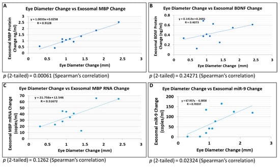 Previously, several brain-derived exosome markers were studied in relation to fetal exposure to EtOH [45,46]. In the present study, FB-Es isolated from the blood of 10 mothers who used EtOH were compared with exosomes from fetal age- and gender-matched controls with respect to several molecular markers and the fetuses’ eye diameters. For all 10 EtOH-exposed fetuses and their age-matched controls the magnitude of the differences in eye size between the EtOH-exposed group and their matched controls were graphed against the magnitude of the differences in the marker levels. Several correlations are illustrated in Figure 6. The molecular marker showing the greatest correlation with eye diameter was MBP (R = 0.9128, p = 0.00061; Figure 6A). Another marker, BDNF, showed no significant correlation (R = 0.41, p = 0.2; Figure 6B). Several synaptic proteins, including synapsin-2 (R = 0.86 p < 0.001), synaptophysin (R = 0.61, p < 0.004), and synaptopodin (R = 0.47, p < 0.04), also demonstrated high correlations (not shown). A correlation between eye size and expression levels of FB-E MBP mRNA did not reach statistical significance (R = 0.52, p = 0.1; Figure 6C), FB-E miRNA-9, assessed by ddPCR, correlated highly with eye size (R = 0.7034, p = 0.02; Figure 6D).