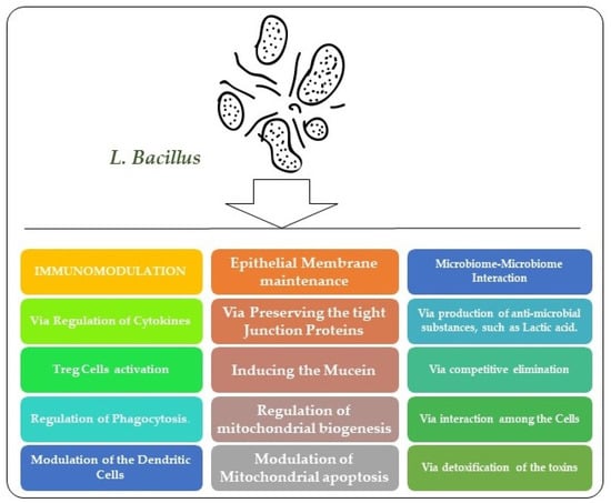 Lactobacilli can perform their probiotic action by following variable mechanisms. They inhibit pathogens by microbe–microbe interaction and refurbish microbial homeostasis. This may occur as a result of antimicrobial substance production and cell-to-cell interactions. They may have an immunomodulatory role, and can either act as immunostimulators or as an immune inhibitor. Immunomodulation results by regulation of cytokine expression, modulation of dendritic cells, and Treg cells, and by effecting phagocytosis [37]. They can also maintain and modulate the functioning of the epithelial barrier by inducing mucin, preserving tight junctions, and by their anti-apoptotic effects [32]. Another mechanism by which probiotics produce a protective effect is by enhancing the level of sIgA within the intestine. The sIgA is involved in the translocation of IgA to the luminal side of epithelial cells which results in enhanced barrier functioning [38]. By attenuating NF-kβ and by enhancing IgA, probiotics up-regulate the level of anti-inflammatory cytokines and down-regulate the pro-inflammatory cytokines level, thus inducing a protective response [39]. By enhancing the levels of DCs and Treg cells, probiotics are a better, natural, and safer candidate for inflammatory diseases. By suppressing the expression of TLR, the expression of TNF-α and NF- kβ is inhibited [40]. Lactobacilli strain can also produce their probiotic action by exhibiting an enzymatic role, particularly β- glucosidase activity. By producing bile salt hydrolase, Lactobacillus species plays a vital role in bile acid metabolism [41].