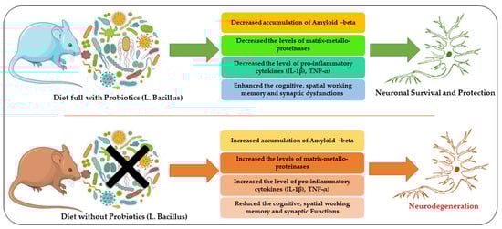 A diagram showing the rescuing effects of Lactobacillus against Alzheimer-associated neurodegenerative conditions. Here, we have presented that a diet with probiotics may reduce neurodegeneration by regulating the accumulation of Aβ, reducing the expression of inflammatory mediators, and enhancing cognitive functions.