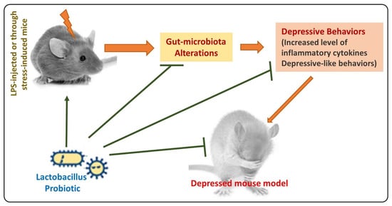 - Smith, C.J.; Emge, J.R.; Berzins, K.; Lung, L.; Khamishon, R.; Shah, P.; Rodrigues, D.M.; Sousa, A.J.; Reardon, C.; Sherman, P.M.; et al. Probiotics normalize the gut-brain-microbiota axis in immunodeficient mice. J. Physiol. Gastrointest. Liver Physiol. 2014, 307, G793–G802. [Google Scholar] [CrossRef]