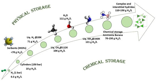 Various methods have been employed to store hydrogen throughout the years, which may be divided into physical (carbon-based sorbents, cryo-compressed and liquified hydrogen) and chemical storage (metal hydrides, complex hydrides and chemical hydrides) (Figure 1). Storing H2 in its molecular state presents a number of precautions and is generally regarded as posing safety risks (extreme temperature and high pressure) in addition to the challengingly-high overall cost, hence the solid-state storage options appear especially appealing by comparison. Hydrogen storage density is crucial for vehicular applications and has become a key requirement of US Department of Energy DOE [35]. The current goal of DOE is to obtain a fuel able to store 5.5 wt% H2 (1.8 kWh/kg, 1.3 kWh/L, costing $9/kWh) by 2025, and ultimately to achieve a hydrogen storage target of 6.5 wt% (2.2 kWh/kg, 1.7 kWh/L, at a cost of $8/kWh). A sustainable hydrogen energy can indeed be built using hydrogen as an energy carrier, but its storage in the solid state constitutes an obstacle (Figure 2) even today. A comparative overview shown in Figure 2 highlights the evolution of gravimetric hydrogen content from various sources H2 (1 bar, 0.3 g H2/L). These include lab cylinders (150 bar, 10 g H2/L), sorbents (MOFs, <70 g H2/L), liquid H2@20K (71 g H2/L), liquid methane CH4@112K (106 g H2/L), water H2O (111 g H2/L), liquid ammonia NH3@240K (121 g H2/L), ammonia borane NH3BH3 (70–150 g H2/L) and complex and interstitial hydrides (110–150 g H2/L). With gravimetric capacities of up to 150 g H2/L, complex hydrides surpass the capacity offered by water (111 g H2/L) and still represent the materials with the highest potential hydrogen storing capacity today.