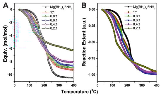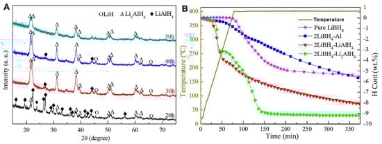 Compared to other reports [147], changing the reagent molar ratio (from 2:1 to 1:1) [185], in the case of LiBH4-NaAlH4 RHC, can yield different products—some of which with proven catalytic activity in hydrogenation cycling (AlB2 for instance [147]). It seems feasible that tuning the molar ratio of reagents and the consideration of possible chemical reactions occurring during de/rehydrogenation can shape the future of RHC, including avenues poorly explored thus far.