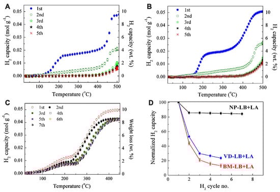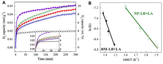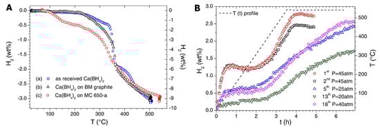 On the other hand, a similar reduction of Ea was achieved by Zhou et al. who melt-impregnated (MI) LiBH4 into activated charcoal (AC), reducing the activation energy for desorption to Ea,des = 121.1 kJ/mol for LiBH4/AC-MI samples that were able to sustain a reversible 6 wt% reversible hydrogen storage content [82].