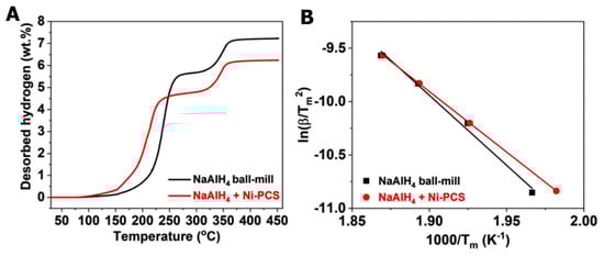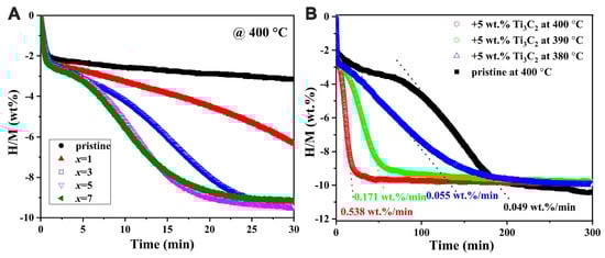 The layered structure of 2D Ti3C2 utilized as hosts can bypass particle growth/agglomeration, providing excellent destabilization of LiBH4 [96]. Among the four compositions studied, the activation energy of LiBH4@xTi3C2, corresponding to mass ratios 2:1, 1:1, 1:2 and 1:3, was dependent on the heating profiles: Ea,1 = 98.27 kJ/mol (12 °C/min) and Ea,2 = 94.44 kJ/mol (8 °C/min).