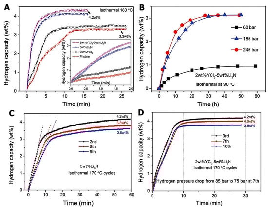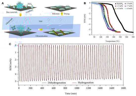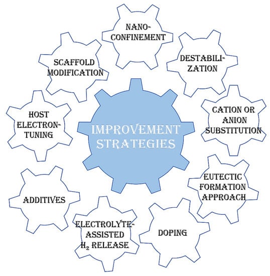 This strategy led to 9.2 wt% hydrogen storage, reversible under moderate conditions (300 °C), confirmed to be non-degrading even after the 100th cycle [86].