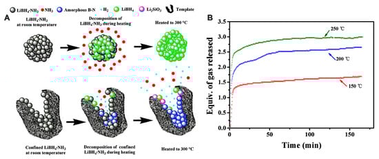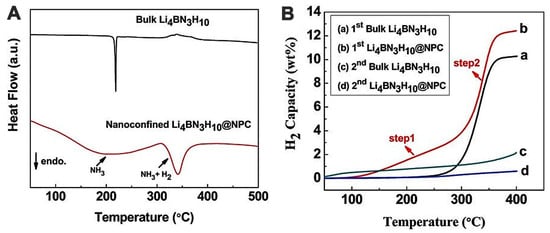 LiBH4 was ground and then melt impregnated into mesoporous carbon hollow spheres (MCHSs) to afford LiBH4@MCHSs composite/pellets [81]. Wu et al. achieved physical confinement of lithium borohydride in double layers of the carbon nanobowls (DLCB). The overall decomposition conforms to Reaction (1). The recorded improvement was quantified by a strong decrease in activation energy, from 177.1 kJ/mol (neat LiBH4) to 121.4 kJ/mol (LiBH4@DLCB-2 nanocomposite), featuring a high volumetric hydrogen density of 82.4 g H2/L [81].