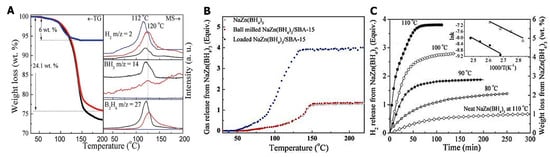The carbon replica of 2D–ordered mesoporous silicfa MSU-H was loaded by up to 40 wt% LiBH4 by the incipient wetness method (0.1 M LiBH4 in tert–butyl–methyl-ether TBME, in 10–40 impregnation-evaporation steps) [106]. However, at lower loading of 8 wt%, LiBH4 remains completely confined into C-MSU-H mesopores (no XRD peaks belonging to borohydride phase). Palade et al. reported the partial rehydrogenation of LiBH4-C-MSU-H nanocomposite at 400 °C (100 bar H2, 2 h) [106]. The same group reported impregnation of LiBH4 into Mo:MSU-H catalyzed siloxanic materials close to melting (~270–280 °C) exhibiting partially reversible behavior [107].