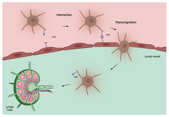 CD9 is also uniformly expressed in melanocytic nevi, leading us to initially consider a protective role of this protein. However, in invasive melanoma, as already seen in other tumors [38,39,40,41,42,43], an increase in CD9 correlates with lymph node metastases, distant metastases, and a worse outcome [37]. This can be explained by considering that tetraspanins can act as both suppressors and promoters of metastases depending on the status of the cell membrane and vesicular structures [44]. Some vitro studies on transendothelial migration of melanoma cells showed a significant role of CD9 in tumor–endothelial/lymphatic cell interaction and vascular dissemination of tumor cells [45]. Therefore, the role of CD9 in determining SLN status seems interesting, as also confirmed by Erovic et al. [46] showing that this tetraspanin is a valid marker for lymphatic endothelial cells and able to promote transmigration of tumor cells through the adherence to lymphatic vessels (Figure 1). Further studies are needed to evaluate its role as a biomarker of the SLN especially in patients with intermediate to thick melanoma.