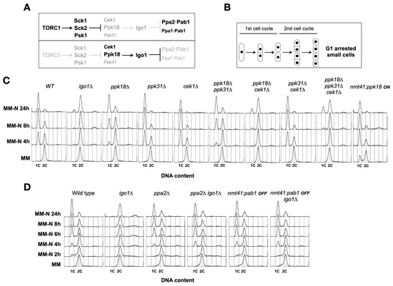 In fission yeast, the master regulator of cell growth TORC1 controls the Greatwall–Endosulfine–PP2A/B55 (Ppk18,Cek1-Igo1-PP2A/Pab1) pathway that functions as a molecular switch to coordinate cell growth with cell size, quiescence, and cell differentiation [15,16,17,18]. In nitrogen-rich media, TORC1 activity is elevated and phosphorylates the S6 kinase orthologues, Sck1, Sck2, and Psk1, which in turn phosphorylate and inhibit Greatwall (Ppk18 and Cek1), a protein kinase that phosphorylates Endosulfine (Igo1), a small protein that in its phosphorylated form acts as a potent and specific inhibitor of the PP2A/B55 (PP2A/Pab1) complex ([15]; Figure 1A). Thus, in nitrogen-rich medium, when TORC1 (and S6) kinase activity is high, the Greatwall–Endosulfine (Ppk18, Cek1, and Ppk31-Igo1) switch is OFF and PP2A/B55 (Ppa1-Pab1 and Ppa2-Pab1) activity is high (Figure 1A, top). In contrast, in nitrogen-poor media, when TORC1 (and S6) activity decreases, Greatwall (Ppk18 and Cek1) is activated and phosphorylates Endosulfine (Igo1) on Serine 64. Phosphorylated Ser64-Igo1 binds to and inhibits the PP2A/B55 phosphatase complex (Figure 1A, bottom). As a consequence, PP2A/B55 phosphatase activity in nitrogen-poor media is reduced, cells divide at a smaller size and undergo proper G1 arrest and entry into quiescence after two successive cell divisions ([15,16]; Figure 1B). Thus, mutants lacking Endosulfine (igo1∆) or Greatwall (ppk18∆ cek1∆) were unable to accelerate entry into mitosis, did not reduce cell size at division, and did not undergo cell cycle arrest in G1 in response to nitrogen starvation (Figure 1C). The igo1∆ and ppk18∆ cek1∆ mutants divided only once and arrested the cell cycle in G2 (Figure 1C; [15,16]). In contrast, moderate overexpression of ppk18+ generated cells with a reduced cell size that were delayed in G1 ([15]; Figure 1C, nmt41:ppk18 ON). These small cells divided only once and arrested the cell cycle in G1 after nitrogen starvation (Figure 1C, nmt41:ppk18 ON).