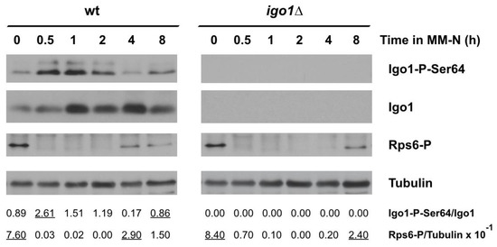 Nitrogen-starved fission yeast cells rapidly inactivate TORC1. Therefore, Greatwall is activated, promoting the phosphorylation of Igo1 at Ser64, which can be monitored using specific antibodies that recognize the conserved phospho-Ser64 epitope. Figure 2 shows that the levels of phosphorylated Igo1 at Ser64 increased in wild type cells, reaching a maximum in 30 min before decreasing after 4 h of nitrogen starvation. This oscillation in Greatwall activity mirrored TORC1 activity (Figure 2, Rps6-P signal). This result clearly indicates that both TORC1 and Greatwall activity oscillate out of phase during the two cell divisions that occur after nitrogen starvation. The transient reactivation of TORC1 after 4 h of nitrogen starvation could be explained by the generation of recycled nitrogen, mainly amino acids, in the vacuole by autophagy (see Section 2.3, Figure 3). Reactivation of TORC1 inactivated Greatwall (Figure 2, time 4 h). TORC1 reactivation also occurred in mutants lacking Endosulfine (igo1∆), but in this case, with a delay of about 4 h (Figure 2, time 8 h). A possible interpretation of this result could be that the onset of autophagy is delayed in the igo1∆ mutant compared to the wild type (see Section 2.3, Figure 3). This experiment clearly indicates that in fission yeast, TORC1 and Greatwall protein kinase activities oscillate out of phase during the two cell divisions that precede G1 arrest after nitrogen starvation.