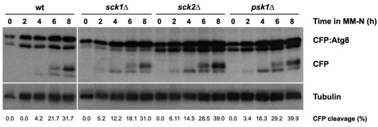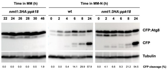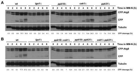 To test whether the Ppk18, Cek1, and Ppk31-Igo1 switch play a role in the regulation of autophagy, we decided to assess autophagic flux in different mutants of this pathway using the processing of N-terminally-tagged Atg8 with CFP as a readout of autophagy. CFP is resistant to protein degradation in the vacuole, and thus, when autophagy is induced, a free CFP band can be detected with Western blot [20,21,22].