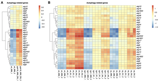 Heat maps of RNA-seq data showing autophagy-related genes induced by the Greatwall–Endosulfine switch. (A) Heat map showing autophagy-related genes upregulated by RNAseq after 20 h of Greatwall overexpression (nmt1:ppk18+) in minimal medium compared to the wild type. Two independent experimental replicates are shown. (B) Autophagy-related genes induced by nitrogen starvation in wild type (wt), igo1∆ (igo1), and cek1∆ ppk18∆ (cp) in MM, MM-N 1 h (N1), and MM-N 4 h (N4). Three independent experimental replicates are shown.