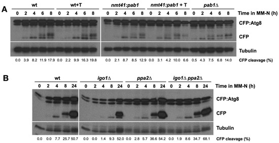 PP2A/B55 negatively regulates nitrogen starvation-induced autophagy. (A) Wild type, nmt41:pab1+ cells, grown in minimal medium with (+T) or without thiamine at 25 °C, and pab1∆ cells grown until mid-exponential phase were transferred to nitrogen-free minimal medium (MM-N) for 8 h at 25 °C. Samples were collected at 0, 2, 4, 6, and 8 h in MM-N. CFP:Atg8 and free CFP levels were determined using anti-GFP antibodies (Clontech). Tubulin was used as a loading control. (B) Wild type, igo1∆, ppa2∆, and igo1∆ ppa2∆ cells grown in minimal medium at 25 °C until mid-exponential phase were transferred to nitrogen-free minimal medium (MM-N) for 24 h at 25 °C. Samples were collected at 0, 2, 4, 8, and 24 h in MM-N. CFP:Atg8 and free CFP levels were determined using anti-GFP antibodies (Clontech). Tubulin was used as a loading control. The percentage of CFP cleavage is indicated under the gels.
