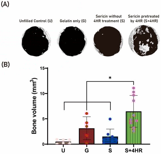 Figure 2A,B). In the animal model, the S+4HR group showed significantly higher BV than that in the S (