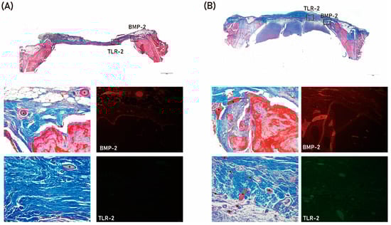 Following mCT image analysis, all specimens were incubated in decalcification solution for 5 days at room temperature. Each decalcified specimen was divided into halves, with one half embedded in paraffin and the other used for protein extraction and western blotting. The paraffin-embedded samples were cut at a thickness of 5 μm and subjected to trichrome staining with a commercially available kit (CAT# HT15, Sigma-Aldrich), and immunostaining with Alexa Fluor®-tagged antibodies specific to TLR-2 (CAT# sc-21759 AF488) and BMP-2 (CAT# sc-137087 AF680), both from SantaCruz Biotechnology (dilution ratio = 1:100). They were applied to slides and incubated in a humidified dark chamber overnight at 4 °C. After washing, each slide was mounted with fluorescence mounting medium (Dako, Glostrup, Denmark). The mounted slide was examined with both Stellaris 5 (Leica Microsystems, Wetzlar, Germany) at the Center for Scientific Instruments, Gangneung-Wonju National University and Olympus fluorescent microscope (BX51, Tokyo, Japan). The immunostaining for runx2 was done with the antibody for runx2 (CAT# sc-390351, SantaCruz Biotechnology; dilution ratio = 1:100). After application of primary antibody and incubation, ready-to-use secondary antibody (Dako® Real Envision®, Dako) was applied and washed with PBS. Chromogen for runx2 was DAB and positive area was shown as a brown color. Runx2 positive nuclei were counted in both groups using image analysis program (Sigma Scan Pro 5.0, Chicago, IL, USA) and compared. Proteins extracted from tissue samples were subjected to western blotting with antibodies specific to runx2 (CAT# sc-390351) and BMP-2 (CAT# sc-137087), both from SantaCruz Biotechnology. Relative expression level of each protein to β-actin was calculated and compared.