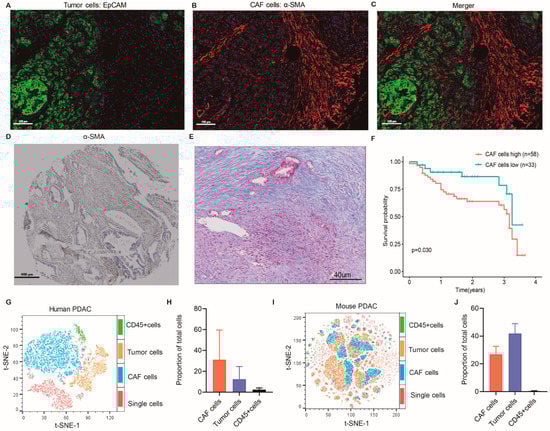 Pancreatic cancer (PC) tissues accumulating α-smooth muscle actin (α-SMA)-positive cancer-associated fibroblasts (CAFs) show a poor prognosis. (A–C) Detection of α-SMA and EpCAM using double immunofluorescence to differentiate CAFs and epithelial cell populations in human PC tissue microarrays. (D) Representative images of α-SMA immunohistochemistry staining in human PC tissue microarray. (E) Representative Masson staining in human PC tissues. Blue color: stroma. (F) Human PC tissues were classified into α-SMA-high or α-SMA-low CAF groups on the basis of α-SMA immunohistochemistry score, followed by examining patients’ overall survival using Kaplan–Meier survival analysis by log-rank test. (G,H) The t-SNE plot of CAFs (CD45−EpCAM−CD29+), tumor cells (CD45−CD29−EpCAM+), and tissue leukocytes (CD29−EpCAM−CD45+) were measured by flow cytometry in human PC tissues. (I,J) The t-SNE plot of CAFs (CD45−EpCAM−PDPN+), tumor cells (CD45−PDPN−EPCAM+), and tissue leukocytes (PDPN−EpCAM−CD45+) were measured by flow cytometry in mouse-derived allograft tissues.