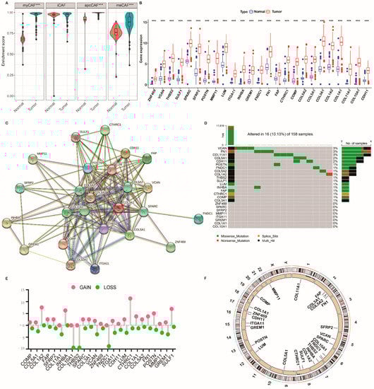 Genetic and transcriptional alterations of CAF-related genes (CRGs) in PC. (A) The enrichment scores of four CAF subsets between normal and PC tissues. (B) Expression distributions of 25 CRGs between normal and PC tissues from GTEx and TCGA cohorts. (C) The protein–protein interaction network acquired from the STRING database among the CRGs. (D) Mutation frequencies of CRGs in 158 PC patients from TCGA cohort. (E) Frequencies of copy number variation (CNV) gain, loss, and non-CNV among CRGs, pink and green represent gain and loss of CNV, respectively. (F) Locations of CNV alterations in CRGs on 23 chromosomes. *** p < 0.001 and not significant (p > 0.05) according to repeated-measures Wilcoxon test.