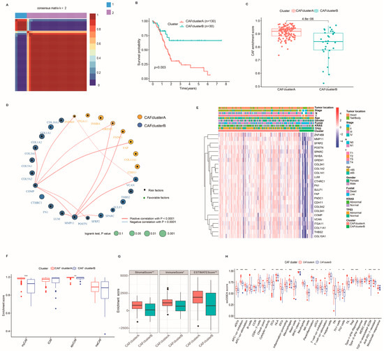Identification of CAF subtypes and characteristics of the TME in PC. (A) Consensus matrix heatmap defining two clusters (k = 2) and their correlation area. (B) Kaplan–Meier plot of overall survival (OS) by CAF clusters for PC patients in TCGA cohort (p = 0.003, log-rank test). (C) Box plots showing CAF enrichment score between CAF cluster A and CAF cluster B. (D) A network of correlations including CRGs in TCGA cohort. (E) Differences in clinical features and expression levels of CRGs between the two distinct subtypes. Stage, gender, age, survival status, and cluster were used as patient annotations. (F) The enrichment score of four CAF subsets between CAF cluster A and CAF cluster B. (G) Correlations between the two CAF clusters and TME score. (H) The infiltration abundance of 33 TME cells of two CAF subtypes in PC. The Wilcoxon test analyzed the statistical differences between the two clusters (*** p < 0.001, ** p < 0.01, * p < 0.05, and not significant (p > 0.05)).