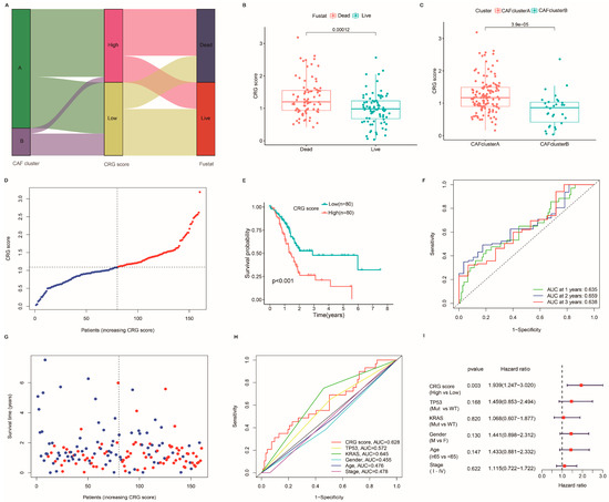 Establishment of the CRG score in TCGA cohort. (A) Alluvial diagram of subtype distributions in groups with distinct CRG score and survival status. (B) CRG score was significantly elevated in patients who died during follow-up. (C) Box plots displaying discrepancies in CRG scores between the two CAF subtypes. (D,G) Ranked dot and scatter plots showing the CRG score distribution and survival outcomes. Red and blue represent dead and alive of PC patients, respectively. (E) Kaplan–Meier plot of overall survival of patients with high and low CRG scores (p < 0.001, log-rank test). (F) Receiver operating characteristic curves to predict the sensitivity and specificity of 1-, 2-, and 3-year survival according to the CRG score. (H) Time-dependent receiver operating characteristic curves of the nomograms compared for 1-, 2-, and 3-year OS in PC, respectively. (I) Multivariate Cox regression analysis demonstrated that CRG score was the most critical risk factor for OS in PC among clinical factors.