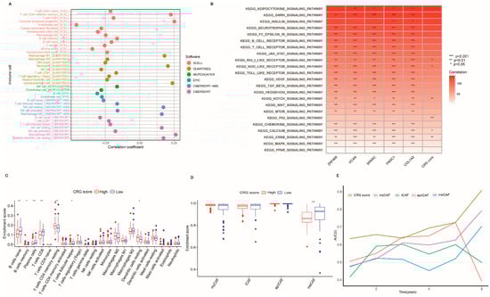 Association of CRG scores with the immune microenvironment. (A) Correlations between the CRG score and immune infiltration. (B) GSVA performed in CRG score signature based on TCGA. (C) The infiltration abundance of 22 TME cells of two CRG-score groups in PC. (D) The enrichment score of four CAF subsets between the low-CRG-score group and the high-CRG-score group. (E) tROC analysis showed that the GRC score was an accurate variable for survival prediction. The Wilcoxon test analyzed the statistical differences between the two clusters (** p < 0.01 and not significant (* p > 0.05)).