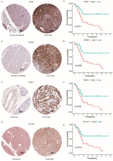 Immunohistochemical results of risk CRG expressions with their influences on OS. (A,B) The protein expression and survival of VCAN. (C,D) The protein expression and survival of SPARC. (E,F) The protein expression and survival of FNDC1. (G,H) The protein expression and survival of COL1A2.