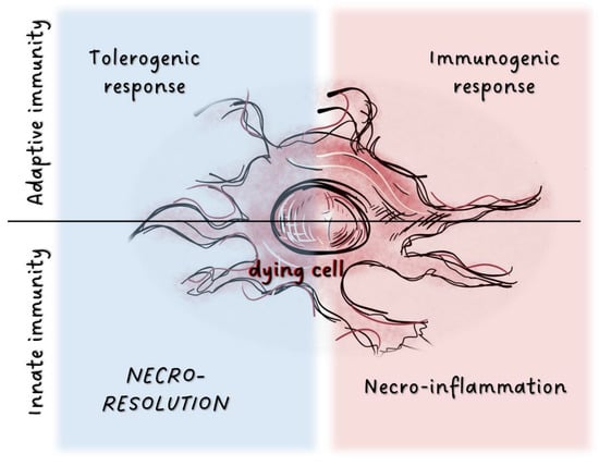 In the last decades, various regulated cell death pathways have been described, differing in triggering stimuli, signaling pathways, and immunological outcomes [5] (Table 3). Cell death processes vary in the mode, extent, and kinetics of cell membrane damage and, consequently, result in the release of different patterns of DAMPs and RAMPs. The differences in the pattern of molecules released during individual cell death pathways may indicate how cell death modalities affect inflammation and resolution.