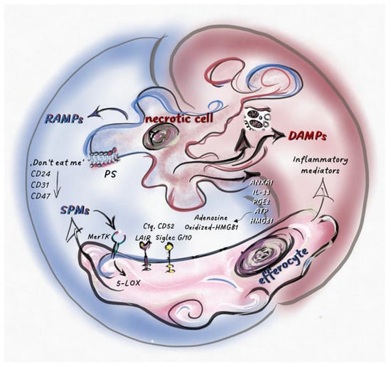 As highlighted previously, most DAMPs and RAMPs do not contain signal peptides; thus, passive release during cell death is one of the main ways for their secretion [8]. The release of DAMPs is inhibited during the removal of membrane-enveloped apoptotic bodies by phagocytosis. We can presume that the secretion of pro-resolution molecules (cytoplasmic, ER–derived, mitochondrial, or nuclear mediators) is inhibited simultaneously by their efficient packaging into apoptotic bodies and subsequent efferocytosis. Consequently, the liberation of SPMs and RAMPs is more likely to be seen during necrotic, rather than classical, apoptotic cell death.