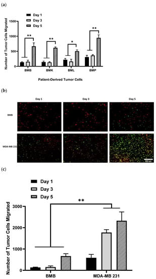 Having previously examined our 3D model for migration and drug screening assay using different aggressive, less-aggressive, and non-cancerous breast epithelial cells lines [], we sought to represent a real bone tissue–tumor interface model by reproducing it with patient-derived tumor cells, isolated from bony spinal metastases (BMX), including BMB, BMK, BML, and BMP. These BMX metastatic spine tumor cells all are aggressive, and we expected to see considerable migration and invasion over different time points. As illustrated in Figure 1a, we observed quite similar amounts of migration for all BMX samples, especially after 5 days, with no substantial difference between cells from different primary tumors individually at the certain time points. However, for each BMX sample, we found significant difference in the number of tumor cells migrated between day 1/3 and day 5. In addition, when they are compared with their equivalent cell lines, for example, BMB cells to their counterparts of MDA-MB 231 (micrographs of Figure 1b and histograms of Figure 1c), there is appreciable variance in the rate of migration and potential growth of BMB and MDA-MB 231 cell lines at the same time point; because patient-derived BMX samples are primary cells, they do not proliferate, migrate, and generally behave the same way that immortalized cell lines do. On the other hand, there might be a possibility of stromal cells migration up to the hydrogel as this reverse effect may have a potential confounding factor which must be addressed in future work. Moreover, since we quantified the number of cells (dots) at each time point, it might not be a representative of definite and pure migration. Indeed, migration analysis needs to be performed with appropriate software enabling live measurement of actual migration parameters, including displacement, speed, and track length, which would be considered as a potential caveat in our future experimental design.