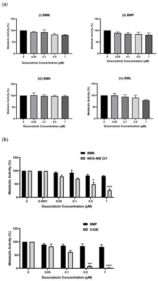 The end purpose of developing this bone or spine metastasis 3D model with primary patient-derived cells is their application in drug screening tests for personalized medicine, to screen novel chemotherapeutics or repurposing chemotherapy combinations, to help patients suffering from cancer. We conducted screening tests of the above-mentioned patient-derived BMX cells with Doxorubicin (Dox) and compared the results with their equivalent cell lines at the similar range of drug concentration. From Figure 2a, we observed that BMX cells were protected from Dox-induced apoptosis, meaning that they were resistant to Dox at the same doses of 0, 0.05, 0.1, 0.5, and 1 µM, which had been used earlier for the corresponding cell lines []. Further, we compared the differences between patient-derived cells and their equivalent cell lines including BMB and MDA-MB 231 breast cancer cells line and/or BMP and C42B prostate cancer cells line by assessing drug sensitivity, as shown in Figure 2b. The results indicated remarkable resistance of patient-derived bone metastasized tumor cells to Doxorubicin compared with consistent drug sensitivity of their counterpart cell lines at the same drug concentrations. This is meaningful data, achieved by applying our PP-3D-S model, showing substantial differences between the response to chemotherapeutics of immortalized cell lines versus patient-derived cells.