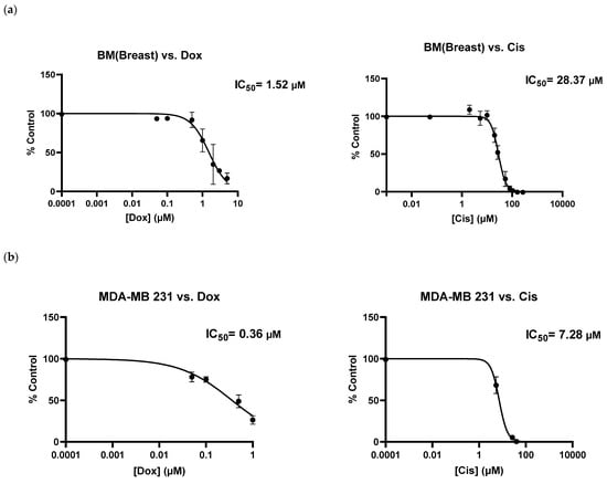 As shown above (Figure 2a), BMB cells were resistant to Dox concentrations between 0.05 to 1 µM. However, by increasing its concentration from 1 to 5 µM (Figure 3a), we observed a marked reduction in metabolic activity of BMB cells, with the relative IC50 value around 1.52 µM. It is interesting to compare this with the IC50 value of MDA-MB 231, 0.36 µM, which clearly shows an important difference in drug sensitivity between BMB patient-derived cells and their equivalent MDA-MB 231 breast cancer cell line. When compared to Cisplatin and the other chemotherapeutic drug used in this study, there was also a considerable difference in chemosensitivities between the two drugs after screening both MDA-MB-231 and BMB cells with Dox and Cis: Comparing the two curves shown in Figure 3a, it is clear that BMB cells are more sensitive to Dox (IC50 = 1.52 µM) than to Cis (IC50 = 28.37 µM) at the same drug concentrations, while Figure 3b reveals a similar trend for the immortalized MDA-MB 231 breast cancer cell line, namely IC50 values of 0.36 and 7.28 µM for Dox and Cis, respectively. We believe that there might be a crucial connection between molecular states before drug treatment and cellular phenotypes induced by different chemotherapeutics after treatment, one that needs to be transcriptionally investigated in our future studies [,,,,,,,]. The results above clearly underline that our current 3D culture model is appropriate for screening not only cell lines, but also different patient-derived metastasis cells with a variety of existing or newly developed chemotherapy drugs for specific patients.