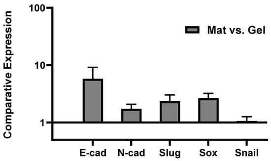Epithelial-to-mesenchymal transition (EMT) and the reverse process (MET) have been widely discussed in the literature as key steps in cancer metastasis: They are biological processes by which cancer cells transit between epithelial and mesenchymal states []. Indeed, immotile epithelial cells undergo multiple biochemical changes and specific morphological alterations in which they lose their tight cell–cell adhesion, switch to mesenchymal phenotypes, and eventually acquire enhanced motility, migratory properties, and invasiveness. Following travel (metastasis) to a new location, multiple steps occur for the metastatic cancer cells to recover to their epithelial characteristics, termed MET, and form a secondary tumor [,,]. Several different biomarkers/signaling pathways and molecular processes involved in initiation of EMT have been proposed in the literature, including expression of cell-surface proteins/markers of EMT: E-cadherin, N-cadherin [,,]; cytoskeletal markers of EMT: Vimentin []; extracellular proteins: Fibronectin []; and activation of transcription factors: Snail, Slug, Zeb, Twist, and Sox families [,,,]. These markers all are upregulated during cancer metastasis, known as mesenchymal markers, except E-cadherin (cell-cell attachment receptor) which is decreased during EMT as epithelial markers [,]. Since we observed significant MDA-MB 231 migration after 5 days (quantitatively proved in Figure 2c), we investigated the possible role of EMT mechanisms through monitoring the expression of E-cadherin, N-cadherin, Twist1, Slug, Snail1, and Sox2 by tumor cells by means of real-time qPCR. As mentioned in the methods, the 3D hybrid model was seeded only with MDA-MB 231 tumor cells, and thus the result from qPCR tests is just presenting the genes expressed by tumor cells in the course of migrating from the hydrogel to the mat while undergoing the EMT mechanism versus those tumor cells that remained in the hydrogel. The reason that the model was cultured only with tumor cells is that by running the model with both stromal cells and tumor cells, it would not be possible to distinguish stromal and tumor cells, including those migrated tumor cells after 5 days of incubation. An option would be to use cell sorting. Both stromal (RFP) and tumor (GFP) cells could be detached from the mats by using trypsin and then sorted by the FACS machine. Future work will attempt to optimize this approach to use co-culture and distinguish effects of multiple cell types. To clarify again, in this paper, the PP-3D-S setup was adjusted based on using only tumor cells for gene expression analysis. Figure 4 shows epithelial and mesenchymal markers expressed by MDA-MB 231 cells that migrated onto the mats, compared with the cells that remained in the hydrogel (data normalized to the gel). Clearly, an appreciable proportion of tumor cells that had migrated into the mats manifested increased expression of mesenchymal markers N-cadherin, Slug, and Sox2 compared with the values in the gel, the expected upregulation of those markers during EMT. However, we found that expression of E-cadherin, the epithelial marker, also showed great increase. This indicates that cells which readily migrated to the mats not only lost their E-cadherin receptors while leaving the gel and acquiring the mesenchymal phenotype while undergoing EMT, but that they also might be able to revert to their original phenotype. Termed MET, this occurs in the secondary environment, the mat in this case, after cell growth and proliferation on the mat over 5 days of culture []. Nevertheless, some limitations remain as we only investigated one tumor cell line and one time point. Thus, future work will have to explore a time course with several tumor cell types to fully understand the impact of EMT on our 3D model. Taken together, these findings highlight that this PP-3D-S in vitro 3D culture model indeed can realistically represent cancer cell migration/invasion processes; here, EMT was manifested by overexpression of mesenchymal markers. Nevertheless, besides numerous published reports in the literature proving that EMT is crucial in metastatic cancer, alternative mechanisms have also been proposed for spreading and metastases. These include collective or cluster-based migration, mesenchymal invasion, and amoeboid invasion (crawling-like cell movement) [].