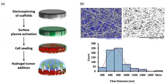 (a): Schematic diagram of the main steps of the current “PP-3D-S” 3D interface model; (b): SEM micrographs of medium-sized electrospun PLA mats (fiber diameter sizes: 730 ± 75 nm; Average pore size: 2.1 ± 0.2 µm; overall porosity: 91.0 ± 1.6%) along with fiber diameter distribution curve; scale bar: 100 µm (adapted from []).