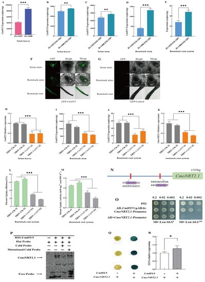 Given the experimental results, CmHY5, CmoHY5-1, and CmoHY5-2 all positively regulated the expression of CmoNRT2.1. In addition, there were also highly significant differences in the expression of CmoHY5-1 and CmoHY5-2 in rootstock stems and the roots of the grafted plants with two different melon scions grafted onto one type of squash rootstock (JS-1429/ZM-1507, JS-1408/ZM-1507) (Figure 3A,B). Furthermore, the grafted plants with the higher expression of CmHY5 owned the higher expression of CmoHY5-1 and CmoHY5-2. However, the direct promotion of CmoNRT2.1 expression by CmHY5 was insignificant, so we speculated that CmoHY5 mediated the regulation of the squash rootstock CmoNRT2.1 by the melon scion CmHY5. To confirm the relationship between CmHY5 and CmoHY5, we first measured the expression of CmoHY5-1 and CmoHY5-2 in the rootstock stems and roots of grafted melon plants with transient silenced CmHY5 in melon scions and found that grafted plants with a lower expression of CmHY5 had a lower expression of CmoHY5-1 and CmoHY5-2 in the rootstock stems and roots (Figure 4A–D). Moreover, we analyzed the promoters of CmoHY5-1 and CmoHY5-2 and found that they both contained the CmHY5 binding element G-BOX in their promoters (Figure 4E). A yeast one-hybrid assay was performed using CmHY5 with the promoters of CmoHY5-1 and CmoHY5-2, respectively. The results showed that CmHY5 could bind to the promoters of CmoHY5-1 and CmoHY5-2, respectively (Figure 4F). An EMSA assay was also carried out with these two components, and the results showed that CmHY5 could bind to both components (Figure 4G,H). In addition, we carried out a tobacco GUS reporter gene assay, in which GUS staining and GUS protein activity were measured on infested tobacco leaves. The results demonstrated that CmHY5 positively regulated the expression of CmoHY5-1 and CmoHY5-2, and the expression of CmoHY5-1 was more effectively promoted (Figure 4I–L).