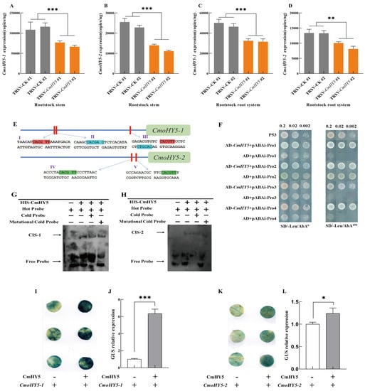 CmHY5 in the oriental melon scion regulates the expression of CmoHY5 in the squash rootstock. Values are means ± SD, n = 3 (biological replicates). Asterisks indicate statistically significant differences (*** p < 0.001, ** p < 0.01, * p < 0.05, Student’s t-test). (A). TaqMan analysis of CmoHY5-1 expression in the squash rootstock stems of grafted oriental melon plants with transient silenced CmHY5 in the oriental melon scions. (B). TaqMan analysis of CmoHY5-2 expression in the squash rootstock stems of grafted melon plants with transient silenced CmHY5 in the oriental melon scions. (C). TaqMan analysis of CmoHY5-1 expression in the squash rootstock roots of grafted oriental melon plants with transient silenced CmHY5 in the oriental melon scions. (D). TaqMan analysis of CmoHY5-2 expression in the squash rootstock roots of grafted plants with transient silenced CmHY5 in the oriental melon scions. (E). Analysis of the promoter cis-acting elements of CmoHY5-1 and CmoHY5-2. (F). Yeast one-hybrid assay to detect CmHY5 binding to the promoters of CmoHY5-1 and CmoHY5-2, respectively. (G). EMSA assay to detect promoter binding of CmHY5 to CmoHY5-1. (H). EMSA assay to detect promoter binding of CmHY5 to CmoHY5-2. (I,J). GUS staining and GUS activity assay in N. benthamiana leaves after transient co-expression of 35S::CmHY5 with proCmoHY5-1::GUS and co-expression with pBI101:GUS as a control. (K,L). GUS staining and GUS activity assay in N. benthamiana leaves after transient co-expression of 35S::CmHY5 with proCmoHY5-2::GUS and co-expression with pBI101:GUS as a control.