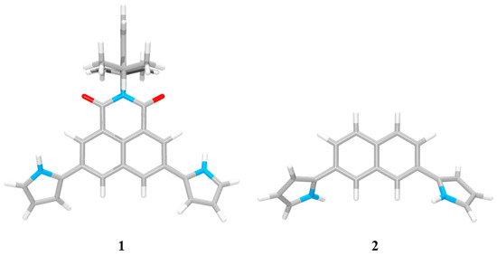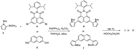 The synthetic procedures for receptors 1 and 2 are shown in Scheme 1. Briefly, N-protected pyrrole-2-boronic acid (3), dibromonaphthalene imide (4), and naphthalene ditriflate (5) were prepared following the previously reported procedures, respectively [58,59,60,61]. The Suzuki coupling reactions of compound 3 with dibromo compound 4 and ditriflate compound 5 carried out in THF/H2O in the presence of Pd(PPh3)4 as a catalyst and K2CO3 as a base produced naphthalene analogues 6 and 7 bearing two N-protected pyrroles in 54% and 75% yields, respectively. Finally, the tert-butoxycarbonyl groups of the pyrrole subunits were removed by heating ethylene glycol solutions containing compounds 6 or 7 to 180 °C for 1 h to give receptors 1 and 2 in 75% and 35% yields, respectively. Receptors 1 and 2 were structurally characterized via general spectroscopic analyses including 1H and 13C NMR spectroscopy and high-resolution mass spectrometry (HRMS).