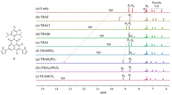 Partial 1H NMR spectra of (a) 1 (3 mM) only, (b) 1 + excess TBAF, (c) 1 + excess TBACl, (d) 1 + excess TBABr, (e) 1 + excess TBAI, (f) 1 + excess TBAHSO4, (g) 1 + excess TBAH2PO4, (h) 1 + excess (TBA)3HP2O7, and (i) 1 + excess TEAHCO3 in CD3CN.