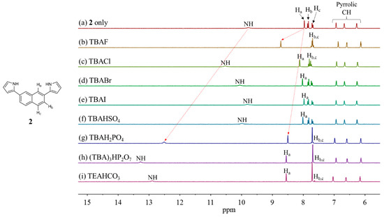 Partial 1H NMR spectra of (a) 2 (3 mM) only, (b) 2 + excess TBAF, (c) 2 + excess TBACl, (d) 2 + excess TBABr, (e) 2 + excess TBAI, (f) 2 + excess TBAHSO4, (g) 2 + excess TBAH2PO4, (h) 2 + excess (TBA)3HP2O7, and (i) 2 + excess TEAHCO3 in CD3CN.
