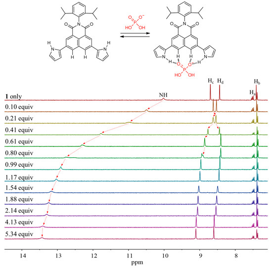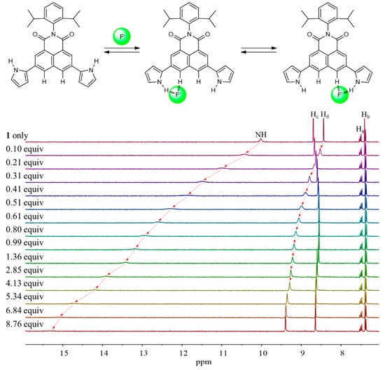 Detailed 1H NMR spectroscopic titrations of receptors 1 and 2 with the test anions were carried out in CD3CN to quantify their binding affinity for the anions under study. For instance, upon the subjection of receptor 1 to titration with the fluoride anion, the proton signals corresponding to the pyrrole NHs and the naphthalene imide CHs (Hd) were dramatically downfield-shifted with increasing quantities of the fluoride anion (Figure 6). These chemical shift changes were attributable to the hydrogen bonds formed between the fluoride anion and both pyrrole NH and aromatic CH protons of receptor 1. These interactions also served to increase the electron density of the naphthalene ring leading to an appreciable upfield shift of the other proton signal corresponding to the naphthalene CHs (Hc). The resulting binding isotherm was best fitted to a standard 1:1 binding profile leading to the association constant (Ka) of 1653 M−1 [64]. The presumed 1:1 binding stoichiometry of receptor 1 for fluoride was further confirmed by Job’s plot experiment (Figure 7). We also carried out titration experiments with poly atomic oxyanions (including HSO4−, H2PO4−, HP2O73−, and HCO3−) bearing multi-hydrogen bond-accepting oxygen atoms. Specifically, when receptor 1 was titrated with the dihydrogen phosphate anion in CD3CN, gradual downfield shifts of both singlet proton signals corresponding to the pyrrole NHs and the naphthalene CHs, respectively, took place before saturation was reached upon addition of 5.34 anion equiv (Figure 8). From this titration and a Job’s plot experiment, receptor 1 was found to bind the dihydrogen phosphate anion with an association constant of Ka = 1326 M−1 and with 1:1 stoichiometry (Figure 7 and Figure 8). Analogous chemical shift changes in the receptor proton signals but with different extents were observed upon exposure of receptor 1 to incremental amounts of other anions such as Cl−, Br−, I−, HSO4−, HP2O73−, and HCO3− (Figures S1–S7). These titration experiments allowed us to estimate the association constants (Ka) of receptor 1 for the anions to be 157 M−1 for chloride, 25 M−1 for bromide, 3 M−1 for iodide, 28 M−1 for hydrogen sulfate, 1531 M−1 for hydrogen pyrophosphate, and 2269 M−1 for bicarbonate, respectively (Table 1) [64]. Receptor 2 showed similar chemical shift changes of the singlet proton signals associated with the pyrrole NH and the naphthalene CH (Ha) when titrated with the anions in CD3CN. From these titration experiments, the association constants of receptor 2 for the anions were calculated to be 196 M−1 for fluoride, 43 M−1 for chloride, 13 M−1 for bromide, 2 M−1 for iodide, 1234 M−1 for hydrogen sulfate, 771 M−1 for hydrogen pyrophosphate, and 946 M−1 for bicarbonate, respectively (Table 1; Figures S8–S16). As shown in Table 1, the association constants of receptor 2 for the anions in question were considerably small as compared with those of receptor 1. Again, this finding is attributable to relatively enhanced acidity of the pyrrole NH and naphthalene CH of receptor 1 presumably because of the electron-withdrawing imide group.