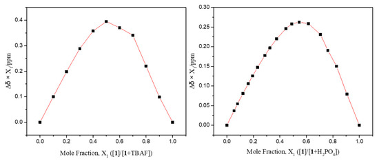 Job’s plots for the interaction of receptor 1 with TBAF (left) and TBAH2PO4 (right), respectively, in CD3CN.