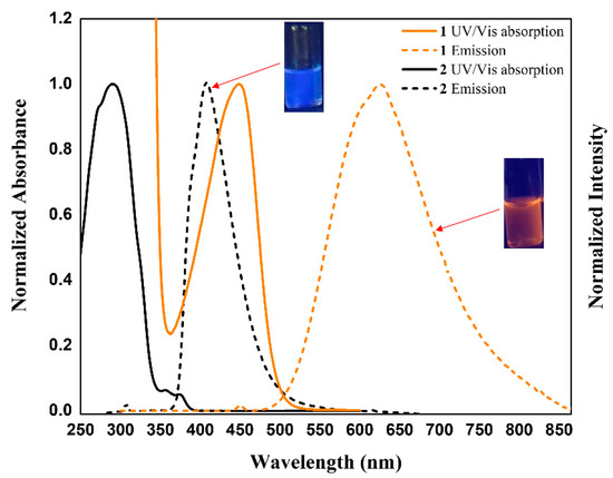 UV/Vis absorption and fluorescence spectra of 1 and 2 recorded in CH3CN.