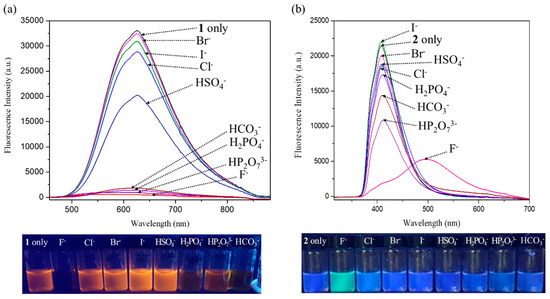 Top: Fluorescence spectra of receptors 1 (a) and 2 (b) in the absence and the presence of the indicated anions (as their respective TBA+ salts for all anions but the bicarbonate anion which was used in its TEA+ salt form) in CH3CN. Bottom: Photographs showing the corresponding fluorescence changes of the CH3CN solutions of receptors 1 (a) and 2 (b). Receptors 1 and 2 were excited at 448 nm and 307 nm, respectively.