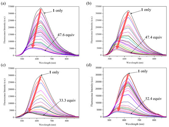Because receptors 1 and 2 exhibited strong fluorescence, we examined their optical properties using fluorescence in the absence and presence of the anions. As expected from the molecular structure, receptor 1, an electron pull-push conjugated system consisting of two electron-donating pyrrole groups directly linked to an electron-accepting the naphthalene imide unit, displays an absorption peak and an emission peak at significantly longer wavelengths than receptor 2 [54,55,56,57]. For instance, receptor 1 exhibits its absorption peak at 448 nm and its emission peak at 625 nm upon excitation at 448 nm, respectively, while receptor 2 displays its maximum absorption and emission peak at 307 nm and 408 nm, respectively (Figure 9). When receptor 1 was treated with excess amounts of the respective anions, its fluorescence was quenched by most test anions. Especially, basic anions such as F−, H2PO4−, HP2O73−, and HCO3− were found to give rise to significant fluorescence quenching (Figure 10a). In contrast, relatively small levels of fluorescence quenching were observed upon exposure of receptor 2 to most test anions (Figure 10b). By contrast, the fluoride anion led receptor 2 to emit red-shifted fluorescence at 498 nm with weakened intensity accompanying a color change from sky blue to cyan (Figure 10b). This fluorescence wavelength change is presumably attributed to partial deprotonation of the pyrrole NH protons of receptor 2 in the presence of an excess quantity of the fluoride anion. We also carried out quantitative titration experiments of receptors 1 and 2 with the anions using fluorescence spectroscopy to evaluate their anion binding affinity at a low concentration relative to the 1H NMR spectral titration condition. For instance, when receptor 1 was subjected to titrations with fluoride, dihydrogen phosphate, hydrogen pyrophosphate, and bicarbonate, respectively, its fluorescence displayed at 625 nm was gradually quenched with slight hypsochromic shifts at high concentrations of those anions (Figure 11). By contrast, other anions gave rise to relatively small fluorescence quenching with no wavelength changes. From these fluorescence titrations, the association constants of receptor 1 were estimated to be 8493 M−1 for fluoride, 484 M−1 for chloride, 674 M−1 for bromide, 1996 M−1 for iodide, 1976 M−1 for hydrogen sulfate, 101,360 M−1 for dihydrogen phosphate, 306,690 M−1 for hydrogen pyrophosphate, and 11,911 M−1 for bicarbonate (Figure 11, Figures S17–S20) [64]. Receptor 2 was also found to exhibit steadily decreasing fluorescence at 448 nm but without wavelength changes over the course of its titrations with the anions in question (Figures S21–S28). Unfortunately, we failed to obtain reliable association constants of receptor 2 for the anions from these fluorescence spectral titrations because error ranges are too large for most anions.