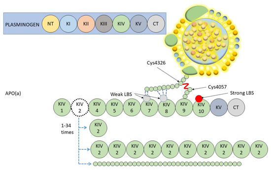 Specific properties relevant for the assembly and molecular pathology of Lp(a) are attributable to Lysine-Binding Sites (LBS), that could be present in some of the KIV domains of apo(a). Weak LSB present in KIV7 and 8 are required for non-covalent interactions with specific lysine domains in the amino-terminal globular domain of apoB-100. This non-covalent association is the first step of Lp(a) assembly and is followed by the formation of a covalent disulfide linkage between apoB-100 cysteine 4326 and the unique unpaired cysteine residue (Cys4057) in apo(a) KIV9. A further important domain is in the KIV10 where a strong LBS mediates interactions with fibrin, but also it contains the site where a pro-inflammatory oxidized phospholipid (generated by polyunsaturated fatty acid oxidation) is covalently attached [19]. These domains are important for the pro-inflammatory and pro-thrombotic properties of Lp(a).
