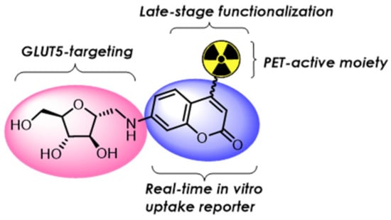 Multiple attempts to use the differences in GLUT activity between normal and metabolically compromised cells have helped to build an understanding of the critical importance of targeting disease-relevant GLUTs in achieving cell discrimination. In this view, fructose-specific transporter GLUT5 has been set as an attractive target since the levels of this transporter were found to alter between normal and cancer cells. Moreover, alterations in GLUT5 activity were observed during cancer development, progression, and metastasis []. Particularly, differences in GLUT5 activity were observed for breast cancer cells providing the basis for using GLUT5-targeting to identify cancer cells [,]. As a result, GLUT5 targeting has been assessed for developing imaging tools.