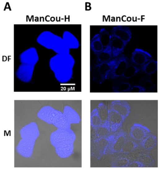 Confocal fluorescence images of MCF7 cells treated with 25 µM of GLUT5 activity reporter ManCou-H (A) and ManCou-F (B). Fluorescence images were obtained using an Olympus FluoViewTM FV1000 confocal microscope and 60× objective. Images were acquired using a DAPI filter (exc/em: 405 nm/461 nm), DF—dark field, and M—fluorescence overlay images with the bright field. The scale bar for all images is 20 µm.